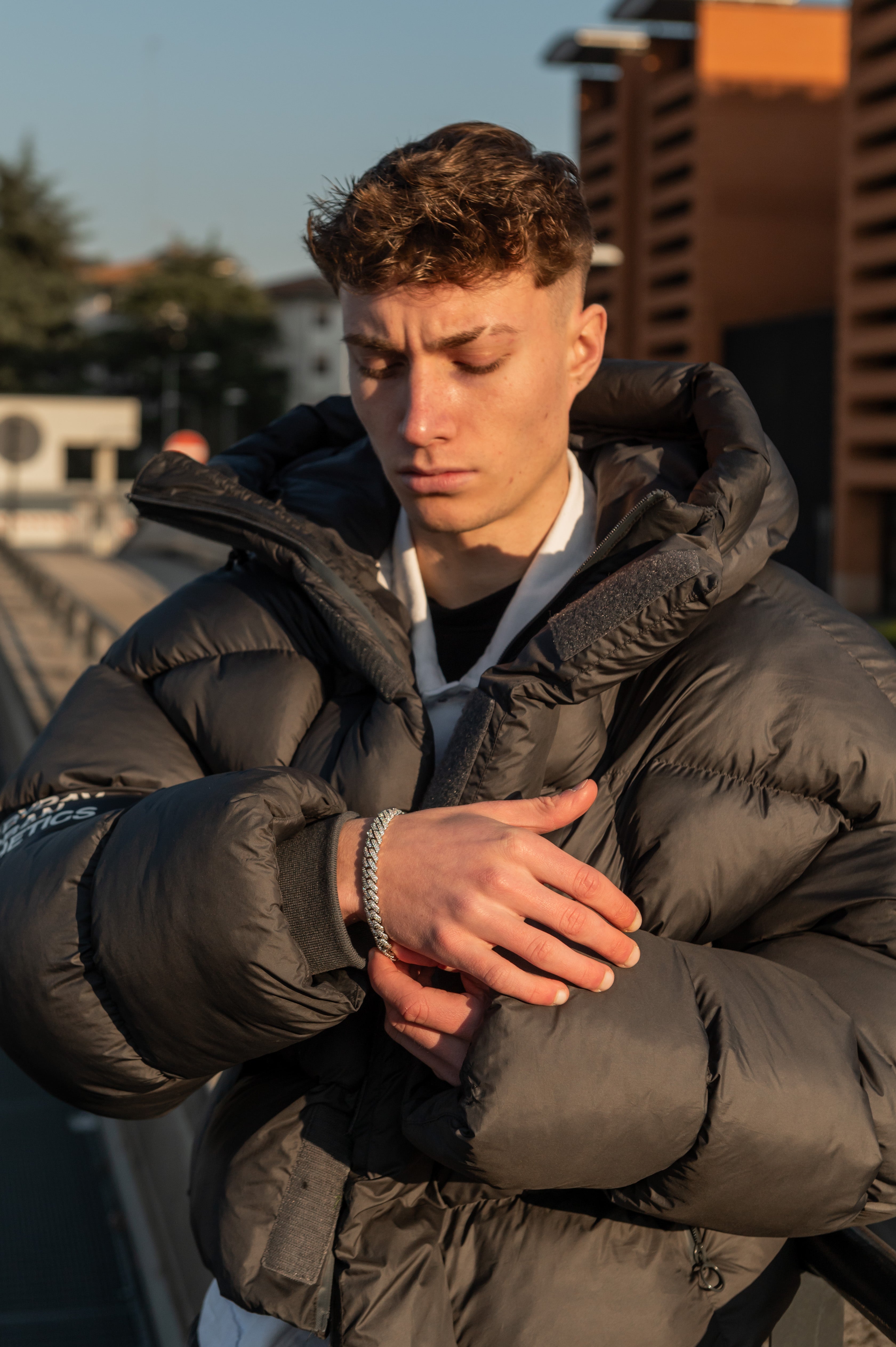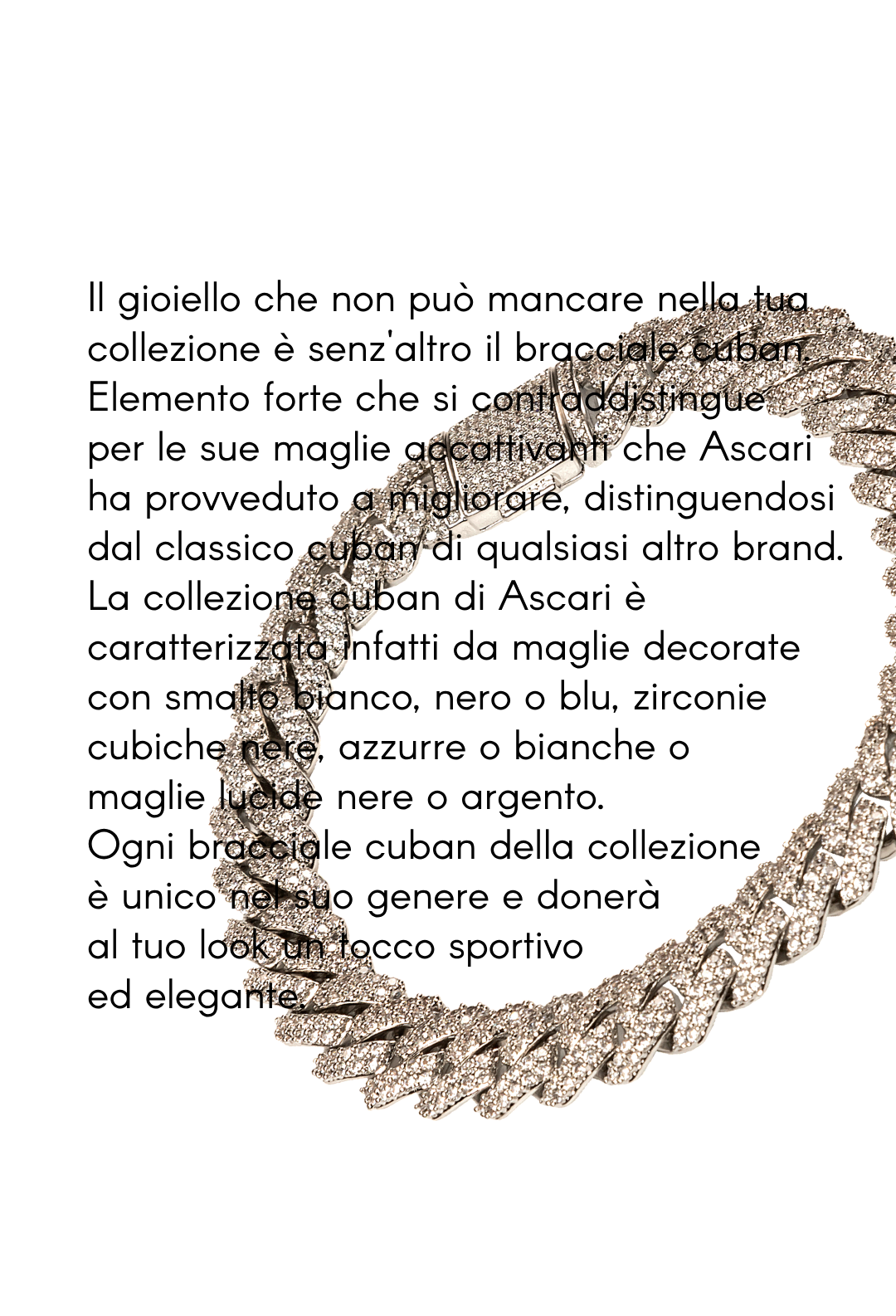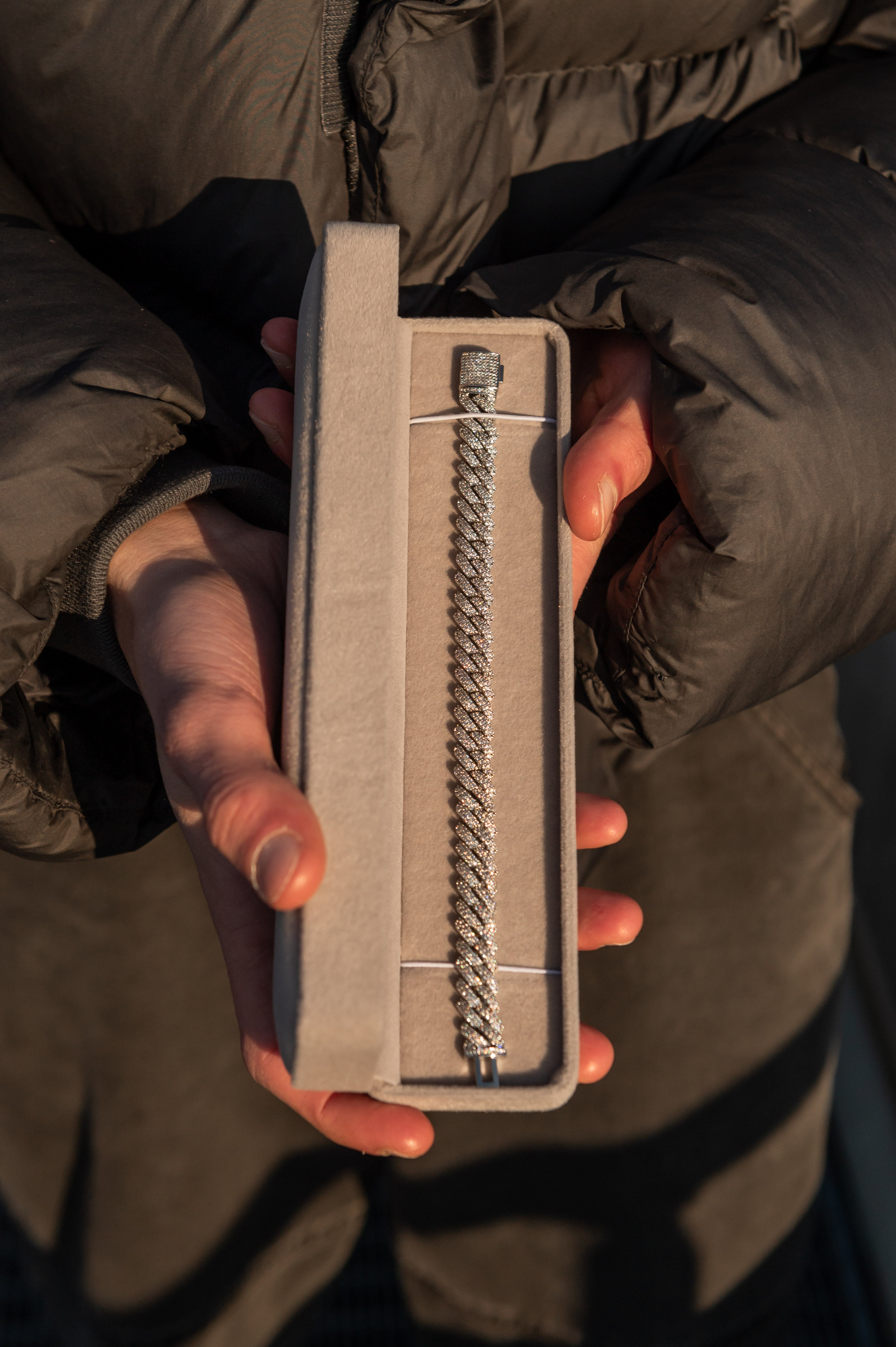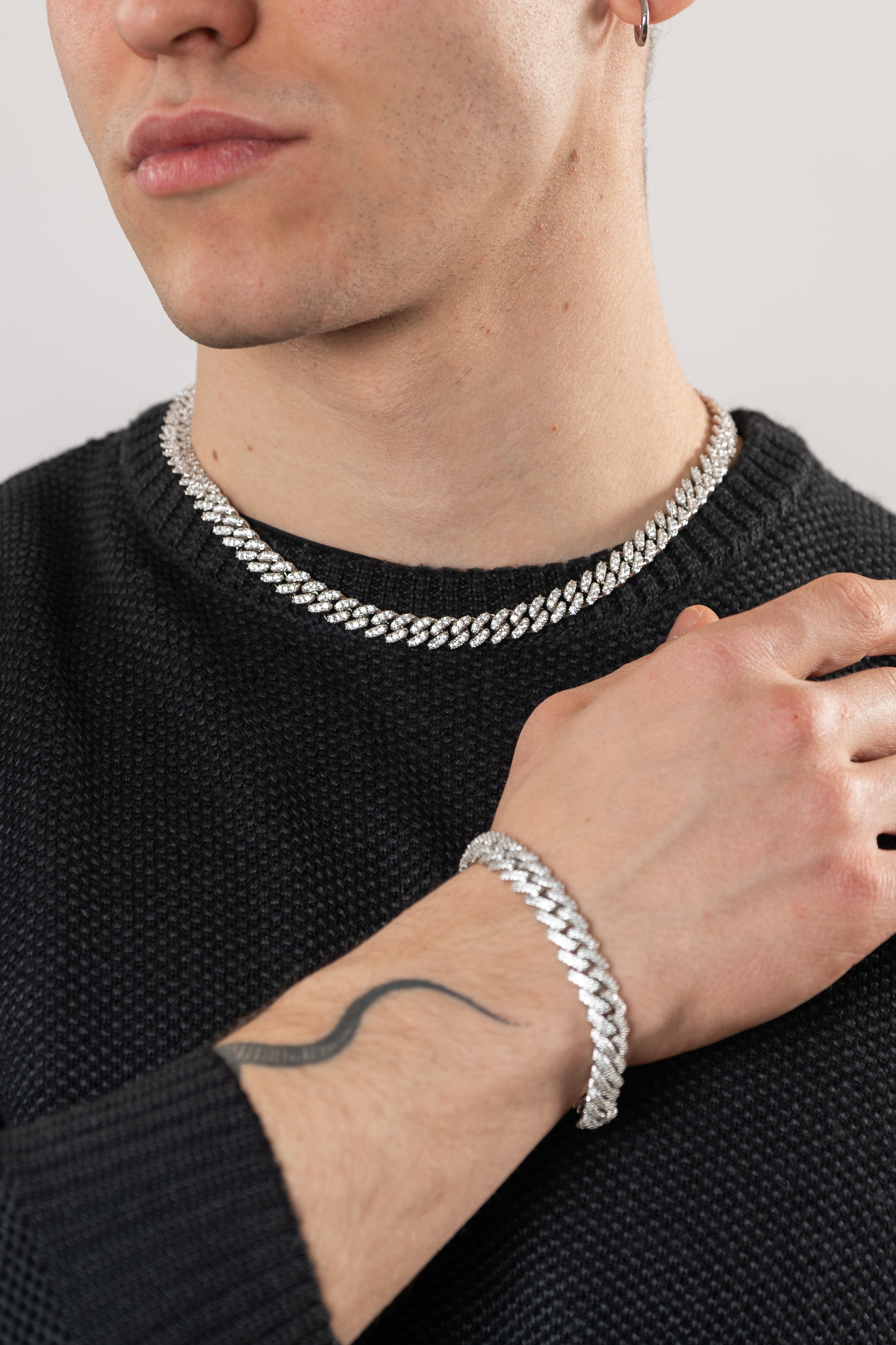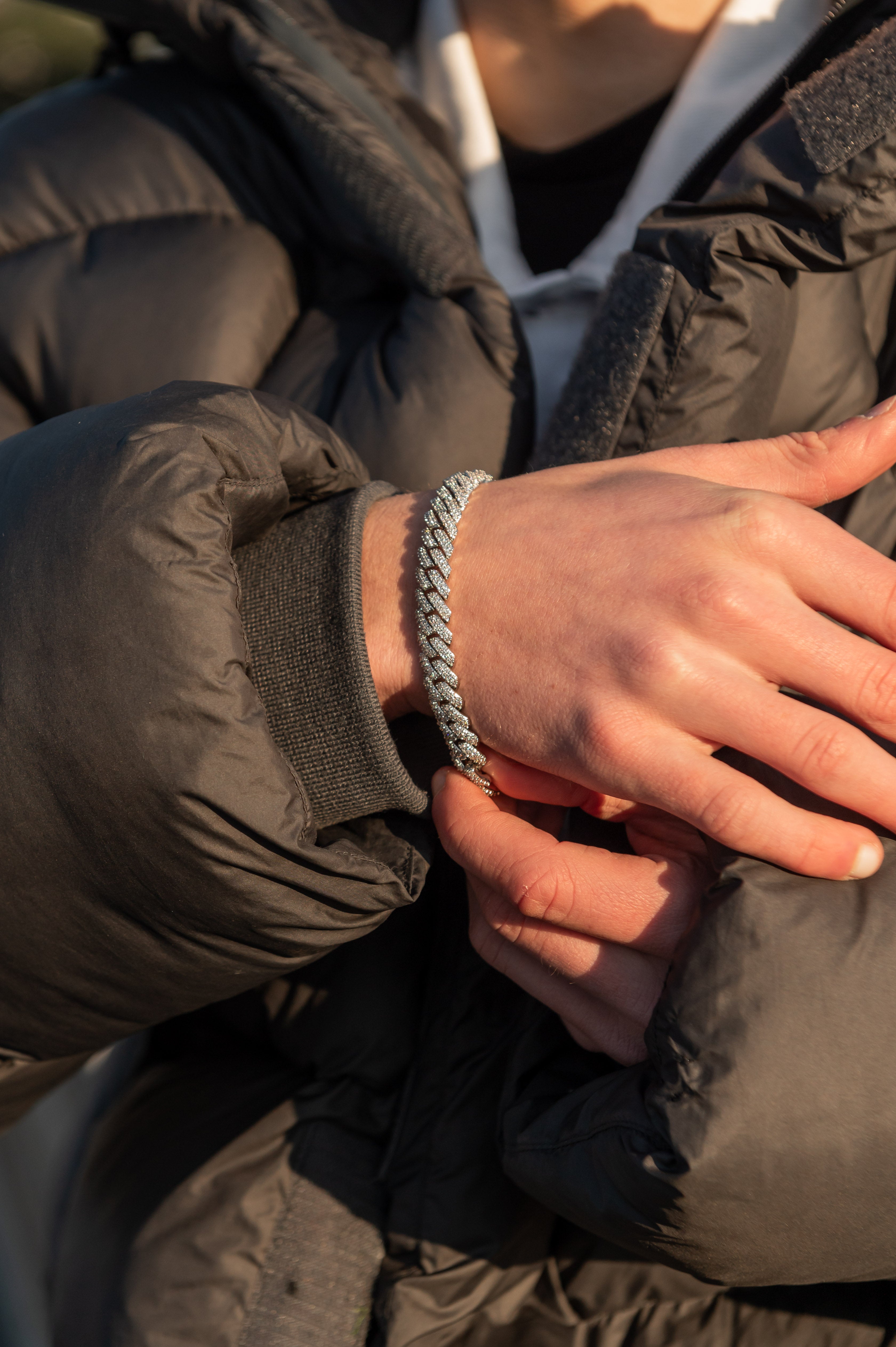 Die Besonderheit des Ice Cuban White Silver Armbands ist neben der Fertigung aus rostfreiem Stahl die Pavé-Verarbeitung seiner Oberfläche. Jedes Glied, einschließlich des versteckten Verschlusses, ist mit Zirkonia-Steinen besetzt, was das Armband einzigartig macht.