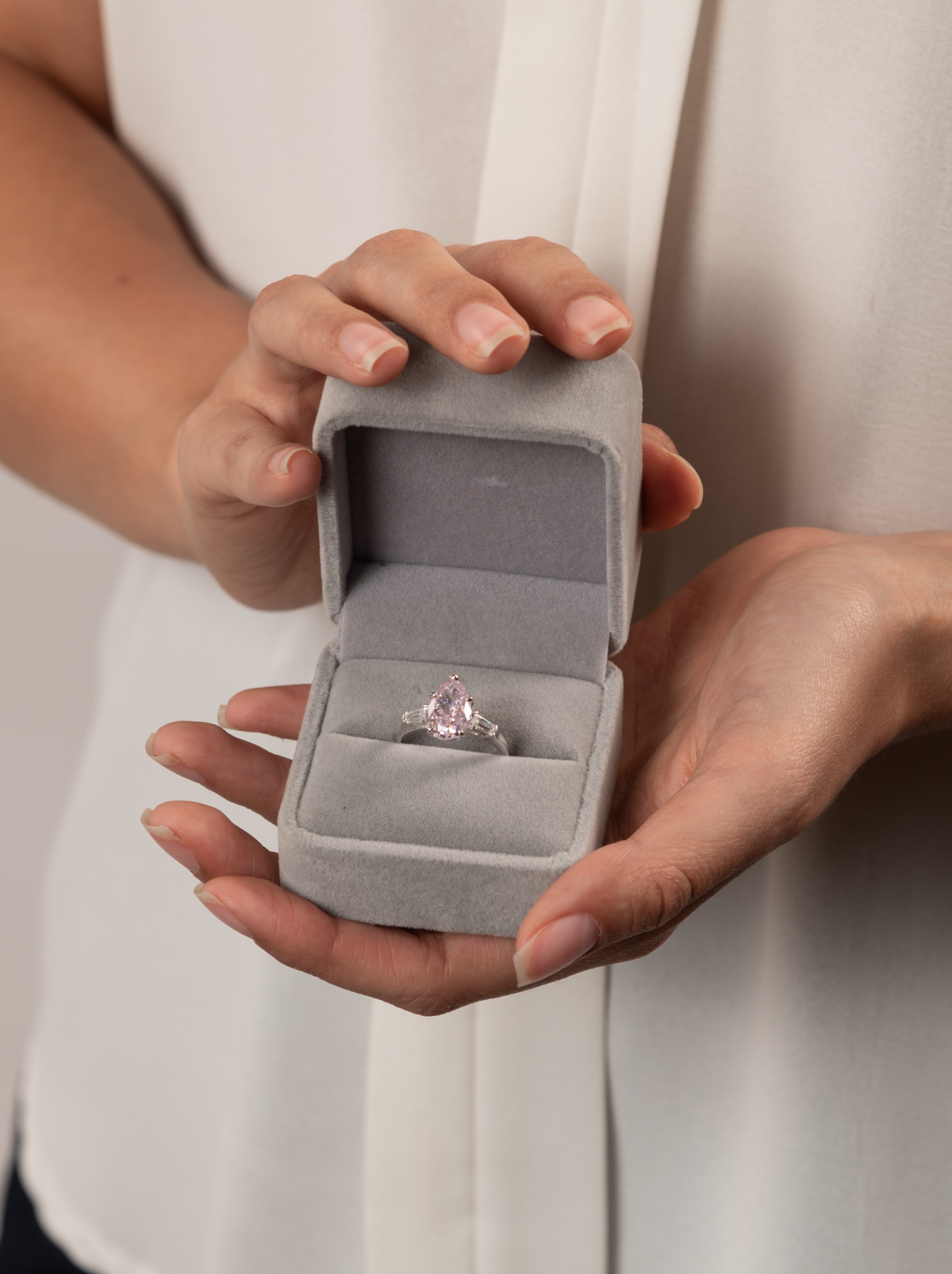 Simbolo di estrema eleganza e raffinatezza l'Anello Grande Pietra Rosa è caratterizzato da un'attenta lavorazione di incastonatura delle pietre zirconie laterali e da quella centrale di un tenue colore rosa.