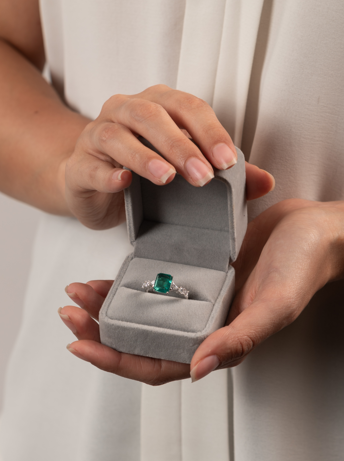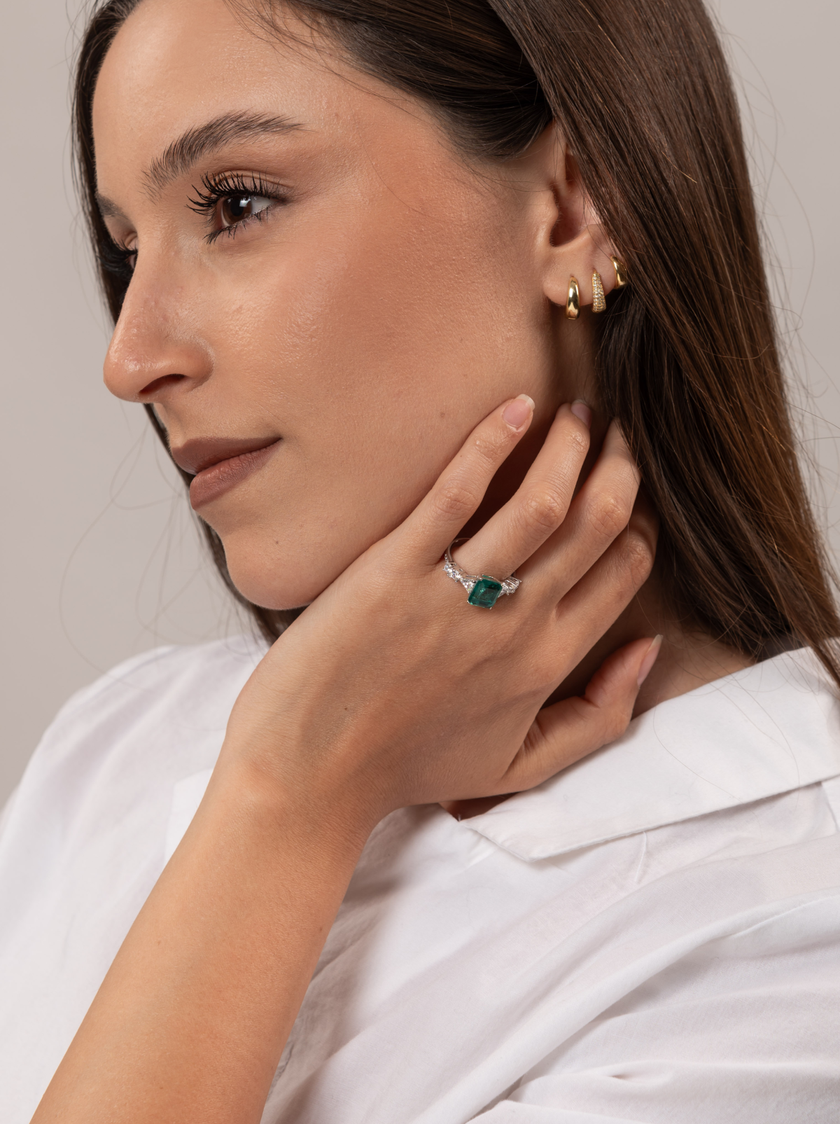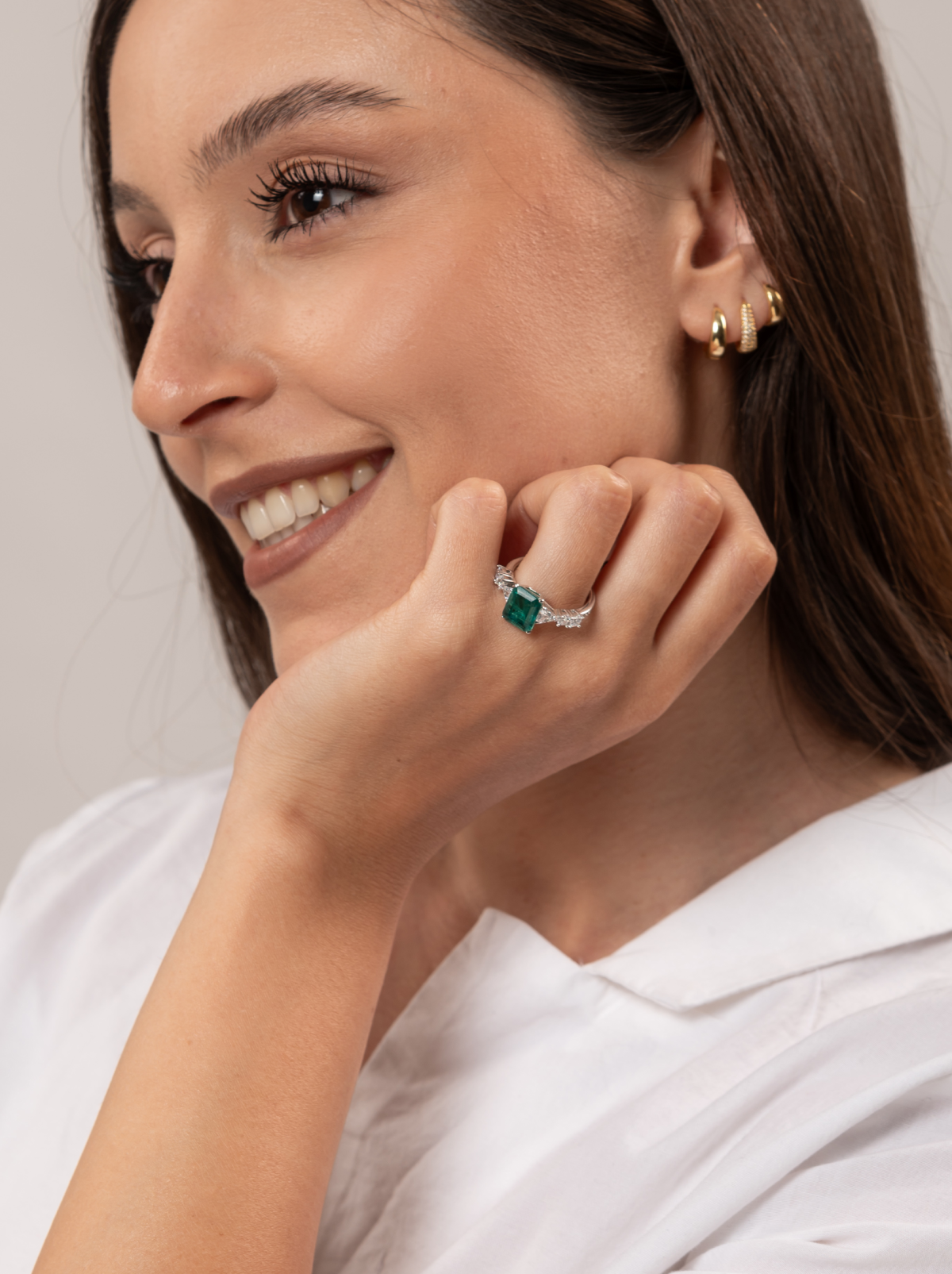 Impossibile passare inosservati indossando l'Anello Pietra Quadra Verde, realizzato in argento Sterling 925 con pietre zirconie cubiche incastonate nella montatura ed una pietra zirconia cubica verde squadrata al centro.
