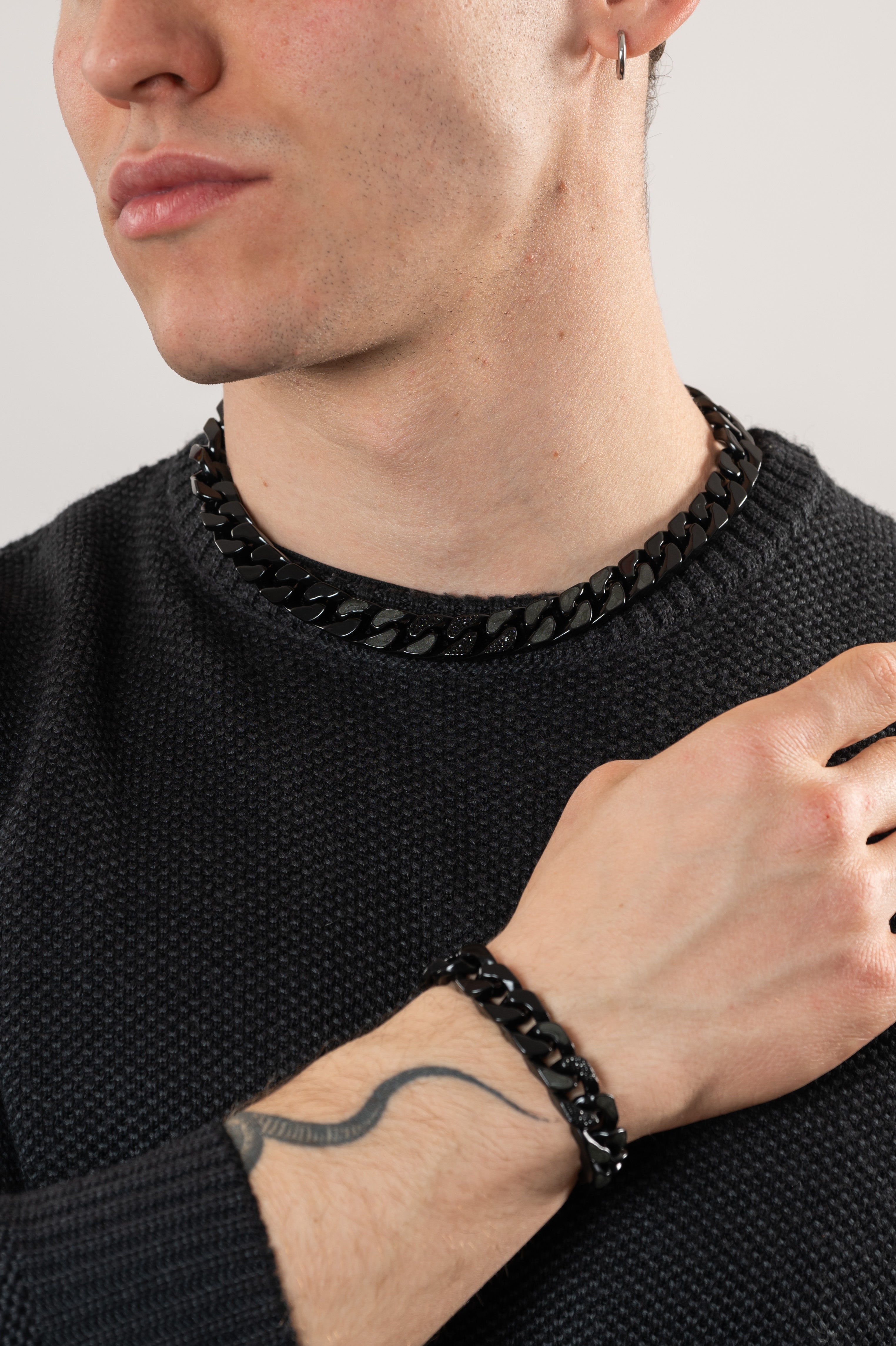 Il cuban è un elemento fondamentale in una forte collezione di gioielli. Il cuban ice white nero impreziosisce il bracciale con le varianti bianche delle maglie e la lavorazione pavè con zirconie cubiche su alcune di esse, donandoli ancora più carattere.