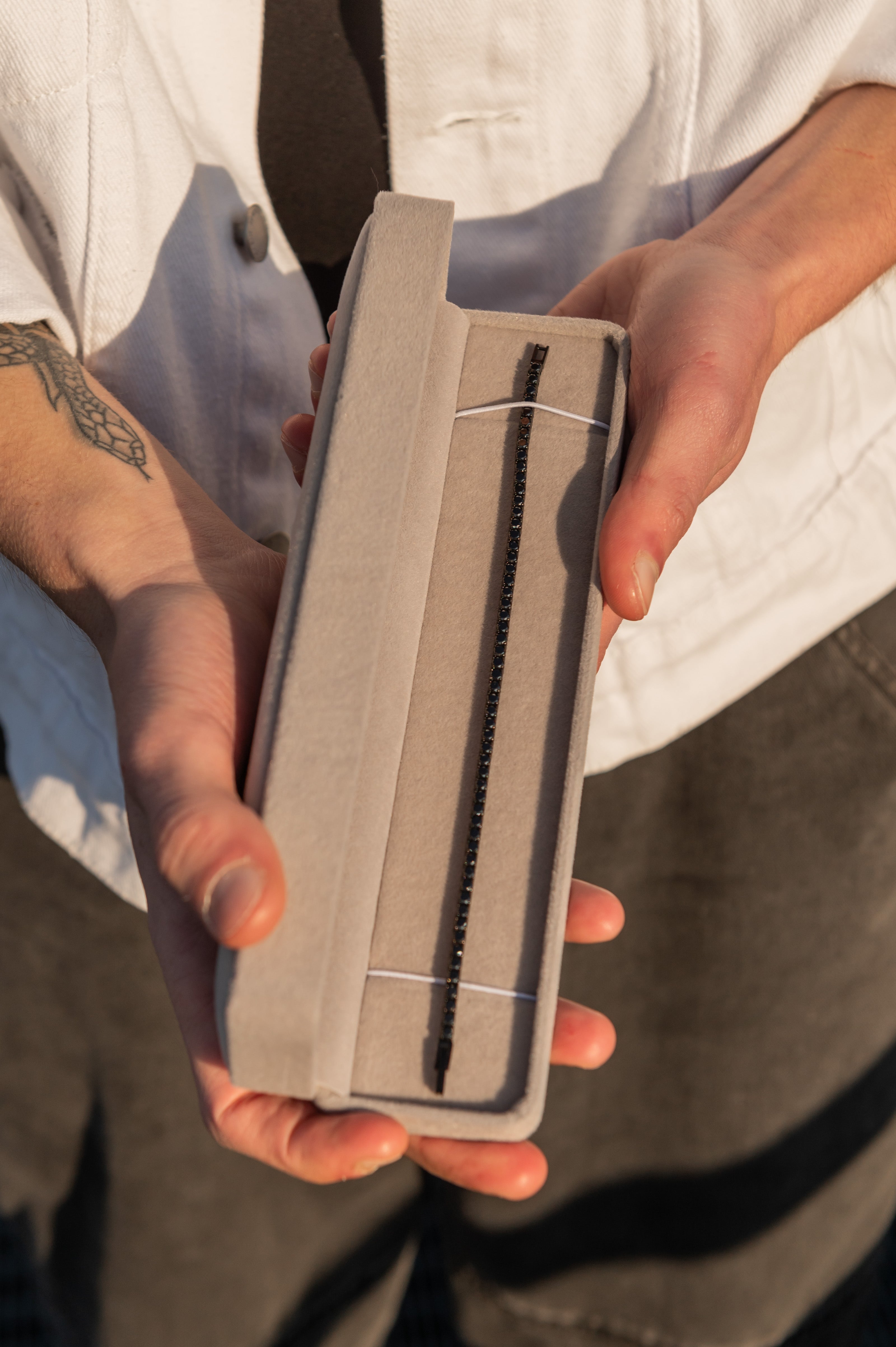 Il bracciale tennis nero black pensato per gli amanti del look dark è caratterizzato dalle pietre zirconie cubiche di grado 5A di colore nero incastonate su una montatura in acciaio inossidabile anch'essa colorata nera tramite lavorazione PVD rendendo questo gioiello estremamente elegante.