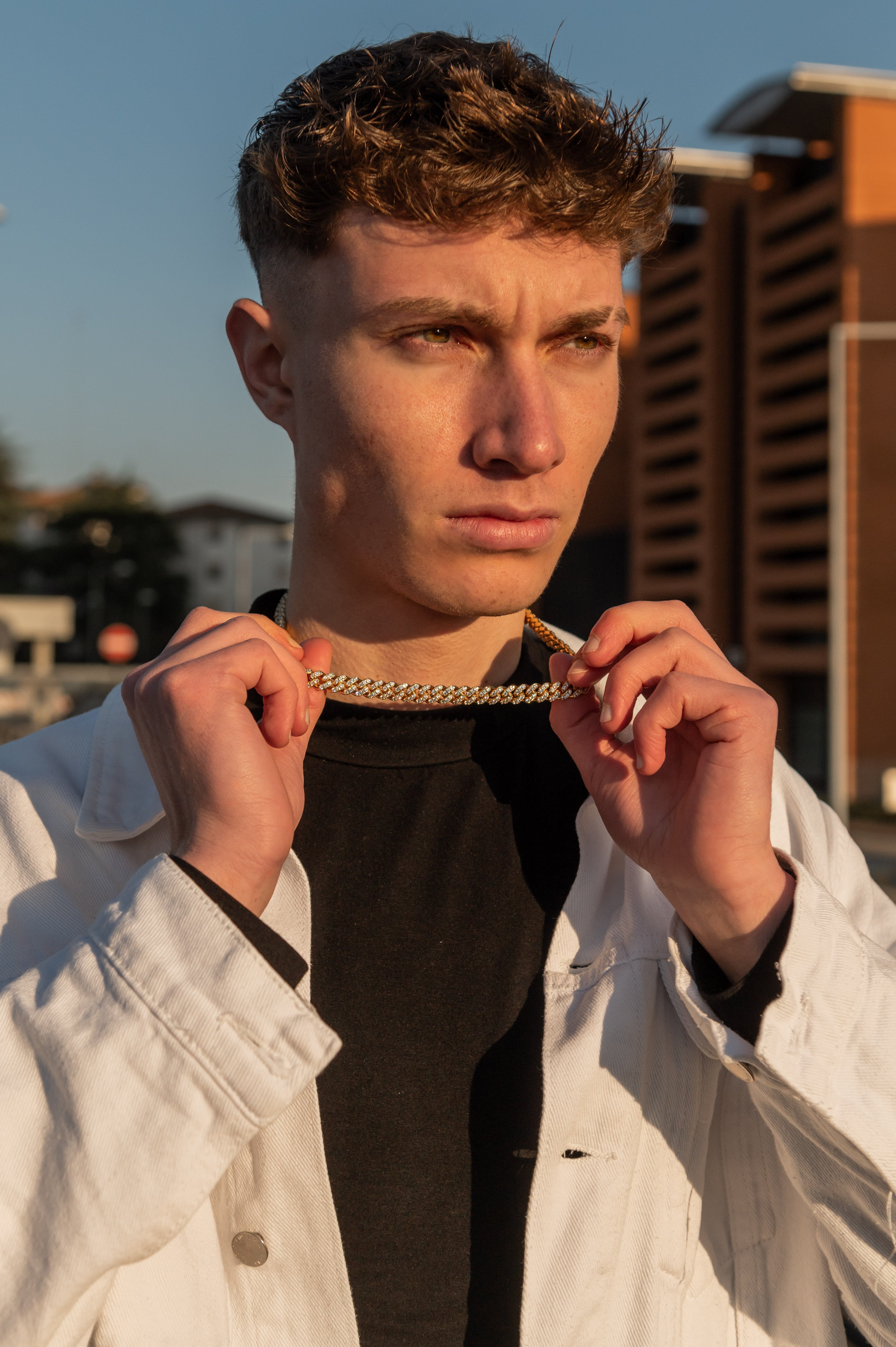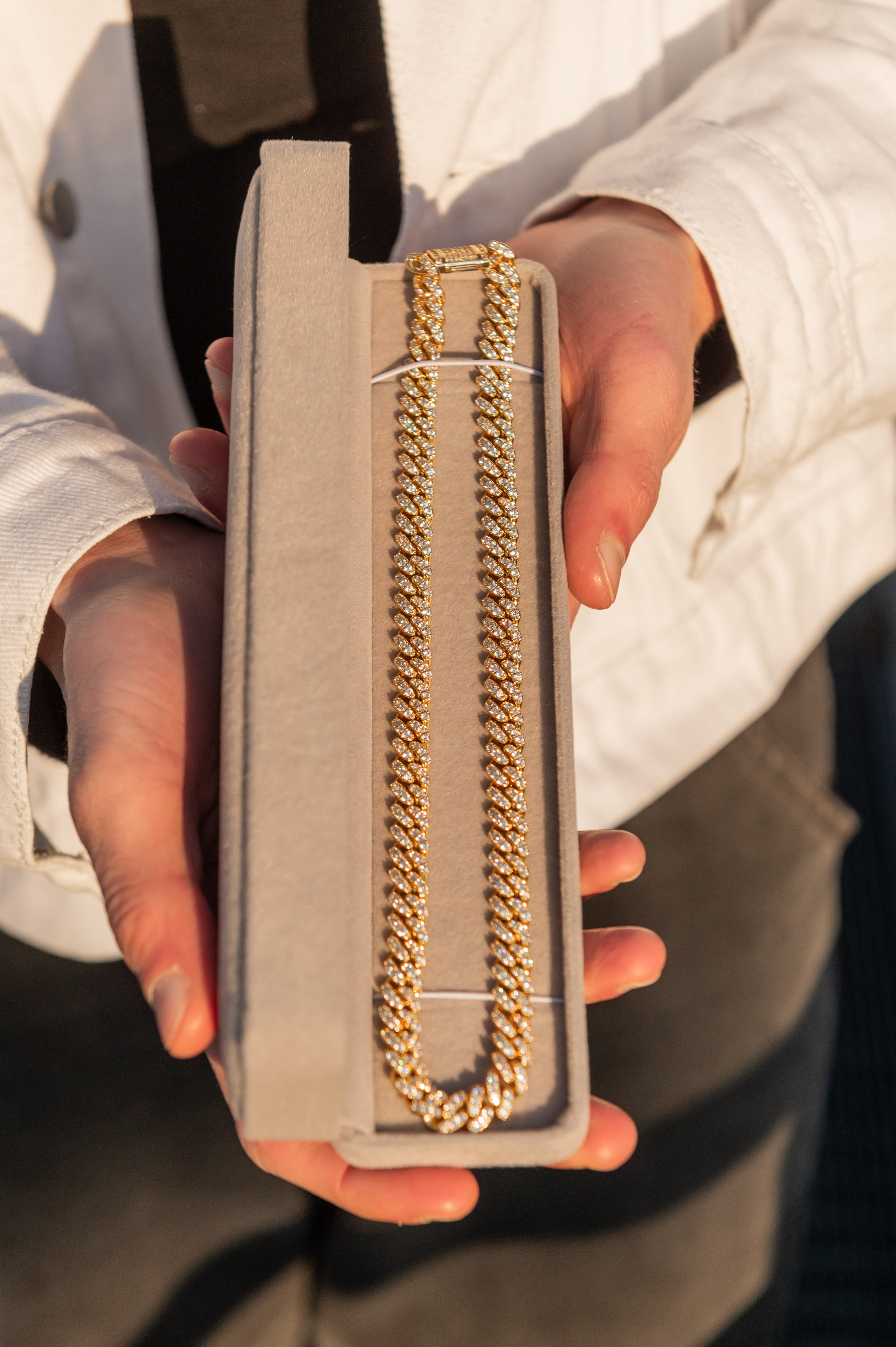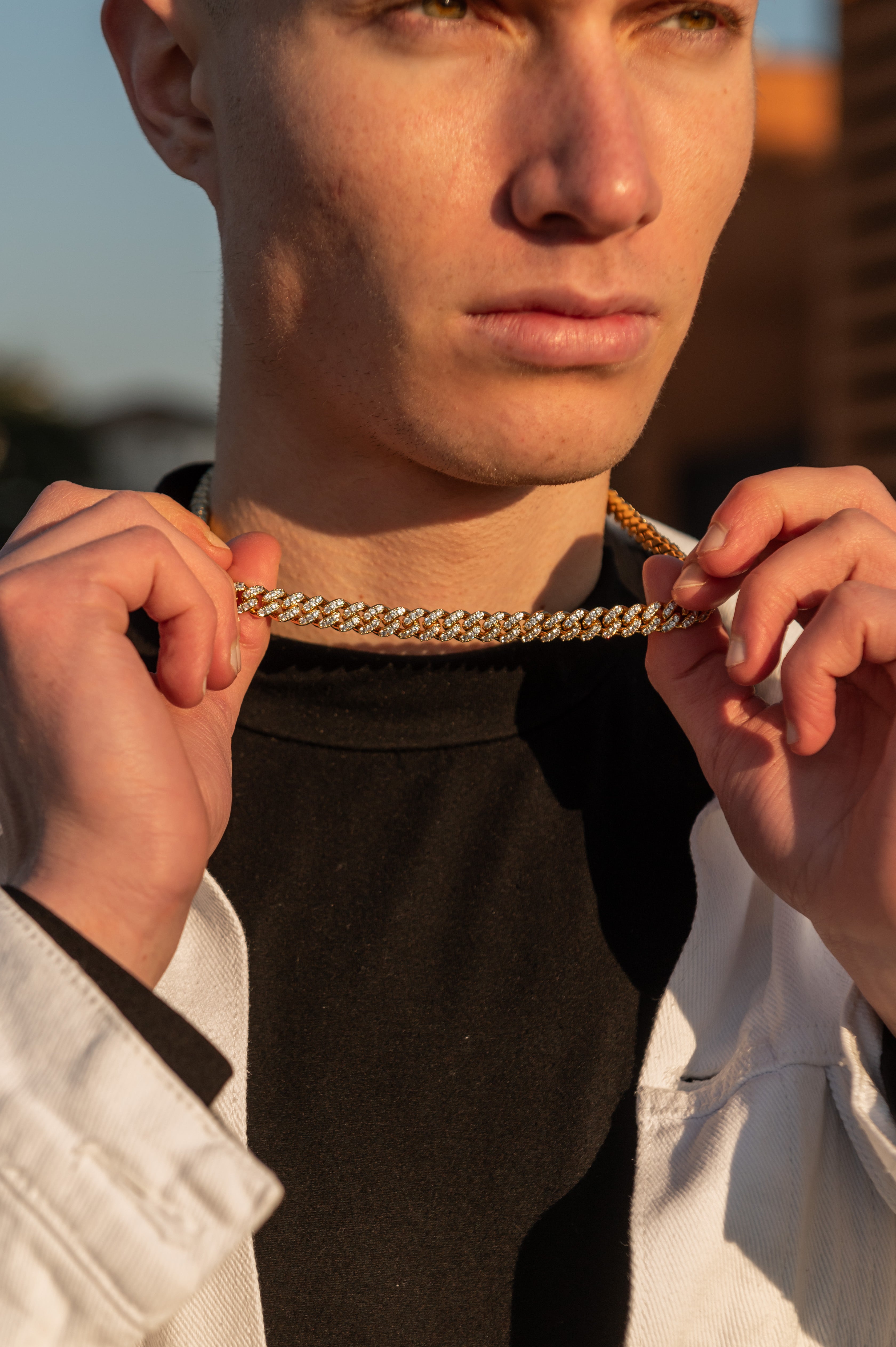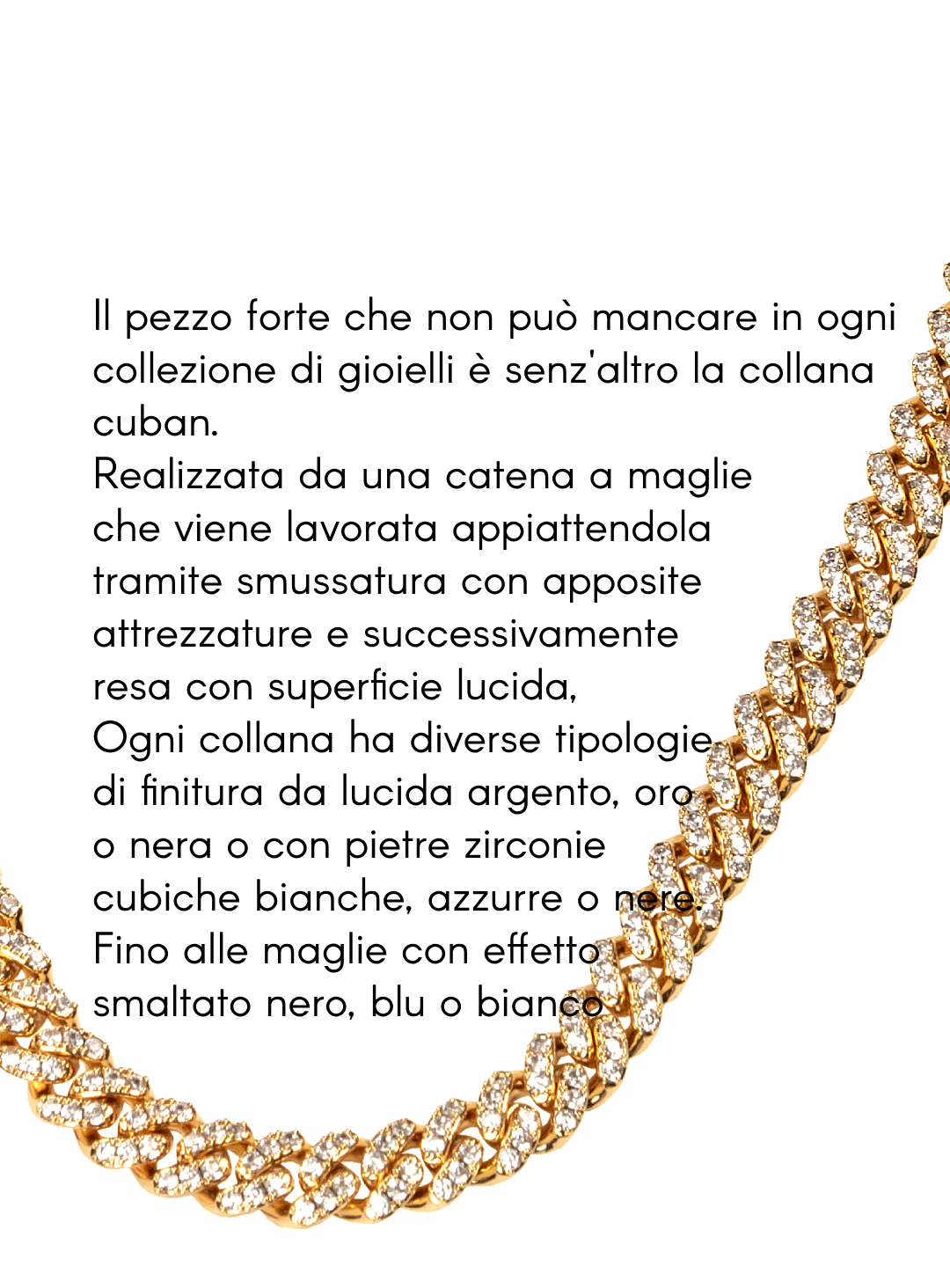 La particolarità della collana ice cuban bianco gold, oltre ad essere realizzata in acciaio anti ossidante, è la lavorazione pavè sulla sua superficie. Ogni maglia compresa la chiusura a scomparsa presenta pietre zirconie cubiche incastonate sulla superficie rendendo la collana semplicemente unica.