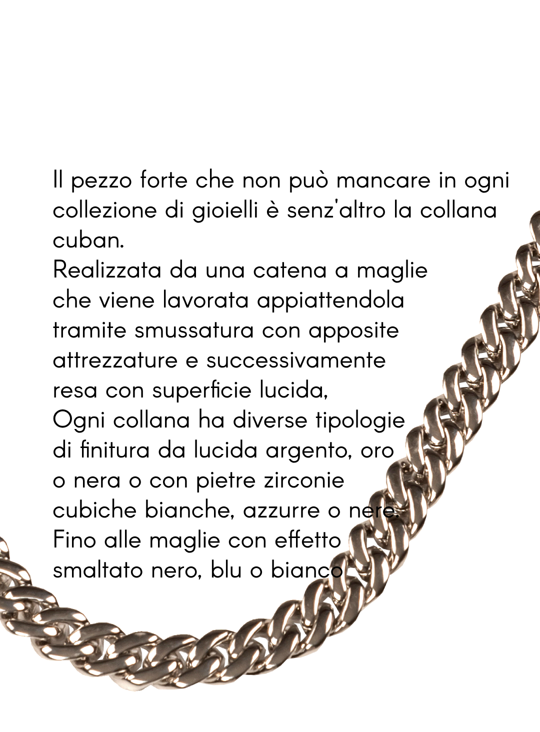 In ogni collezione da uomo è presente un elemento forte come la collana cuban. La collana cuban di Ascari, realizzata interamente in acciaio inossidabile, compresa la chiusura a scomparsa, viene realizzata dando alle maglie rotondità per adattarsi meglio al collo.