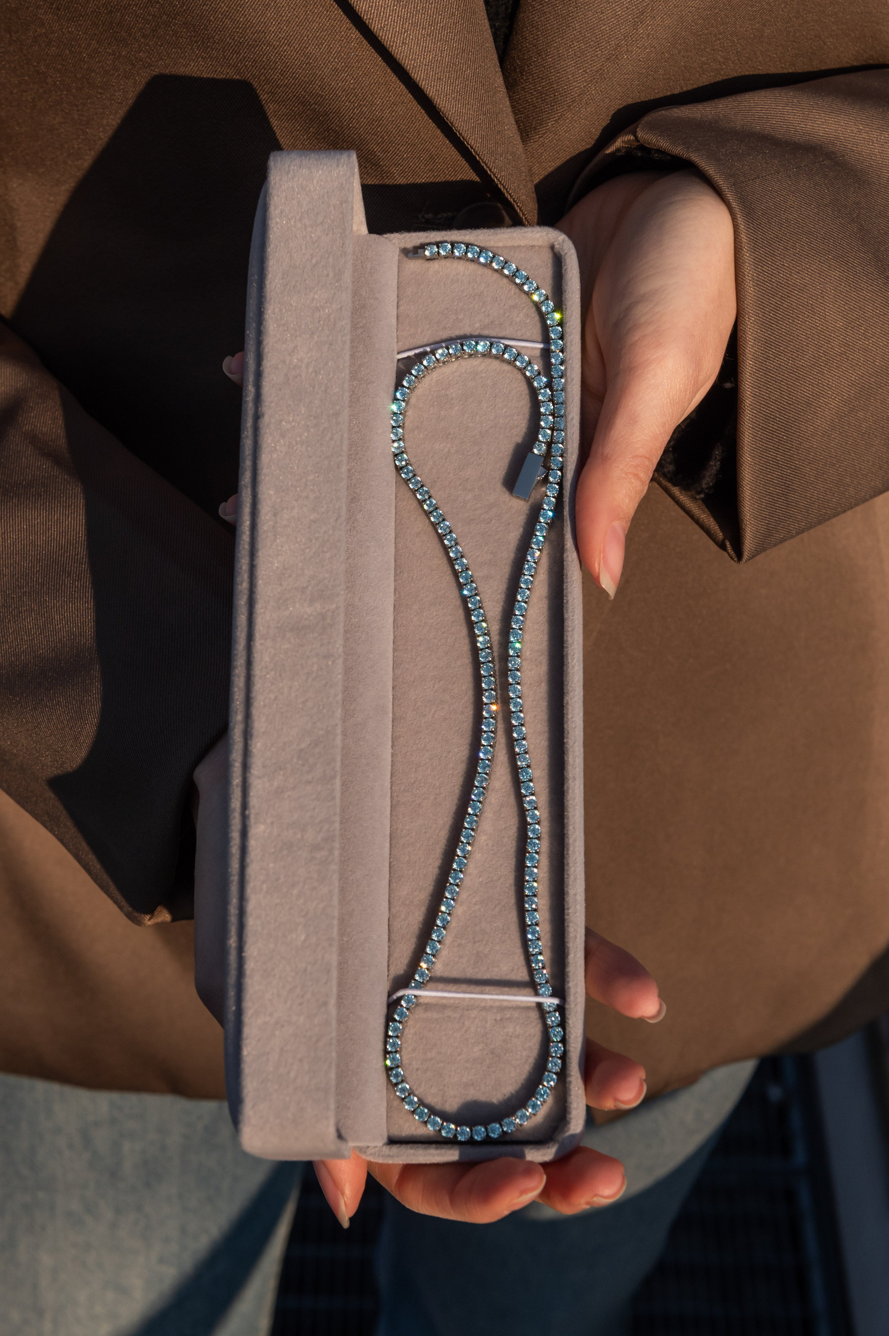 Ispirato all'azzurro del mare questa collana ne richiama l'eleganza con un fascino che la rende unica. Nella classicità della collana tennis Ascari Gioielli™ ha realizzato una collana con montatura in acciaio inossidabile 316L impreziosita dalle pietre zirconie cubiche di grado 5A di colorazione azzurra.
