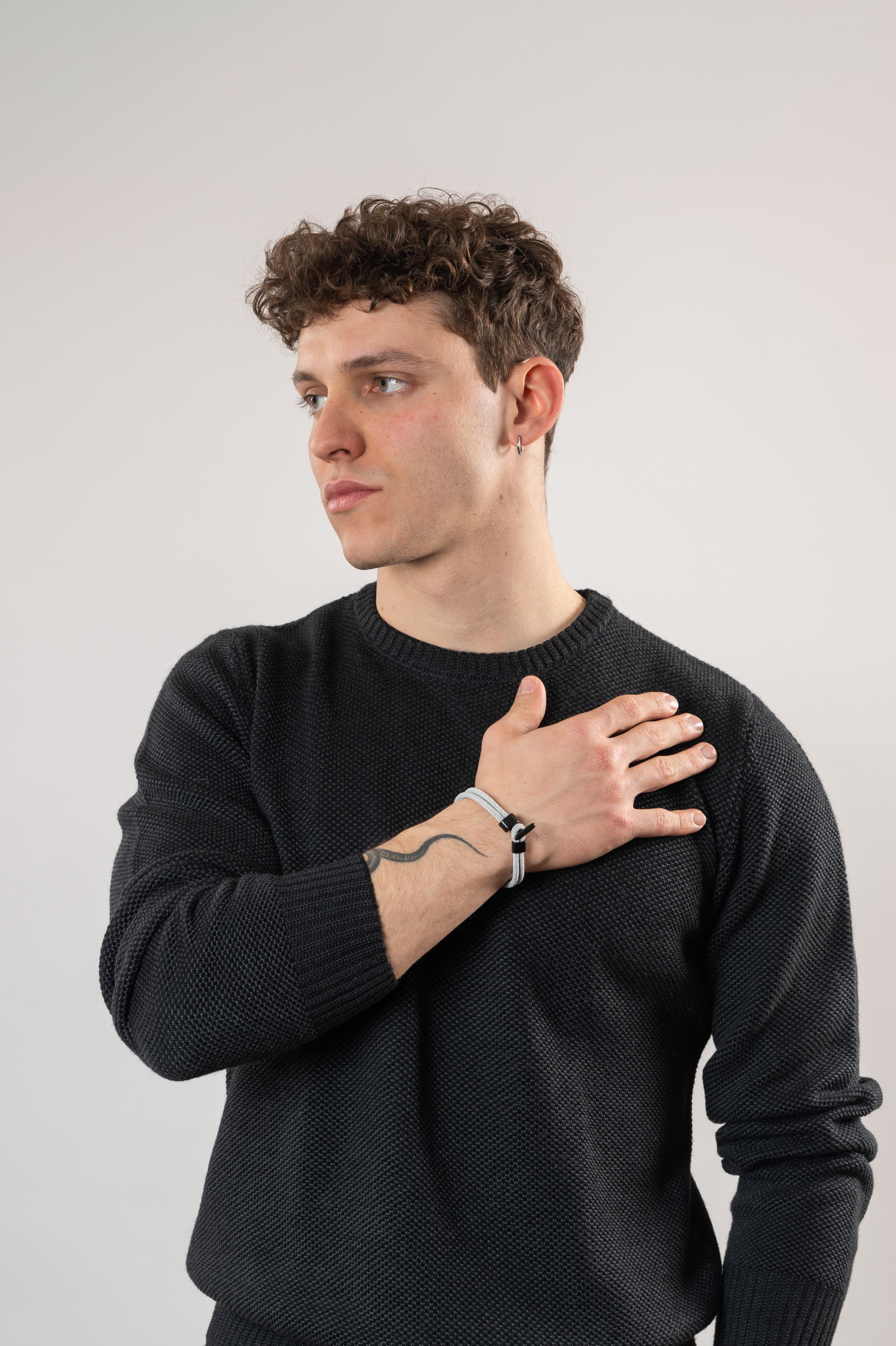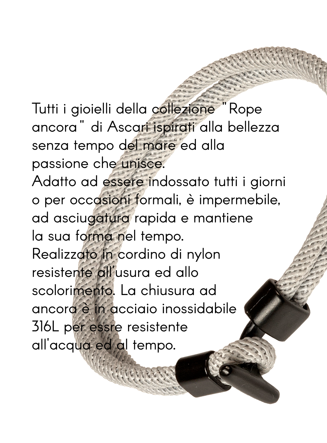 Per gli amanti del mare e dello sport a vela Ascari Gioielli™ ha concepito un bracciale in vera corda con particolare chiusura ad ancora in acciaio inossidabile nera.