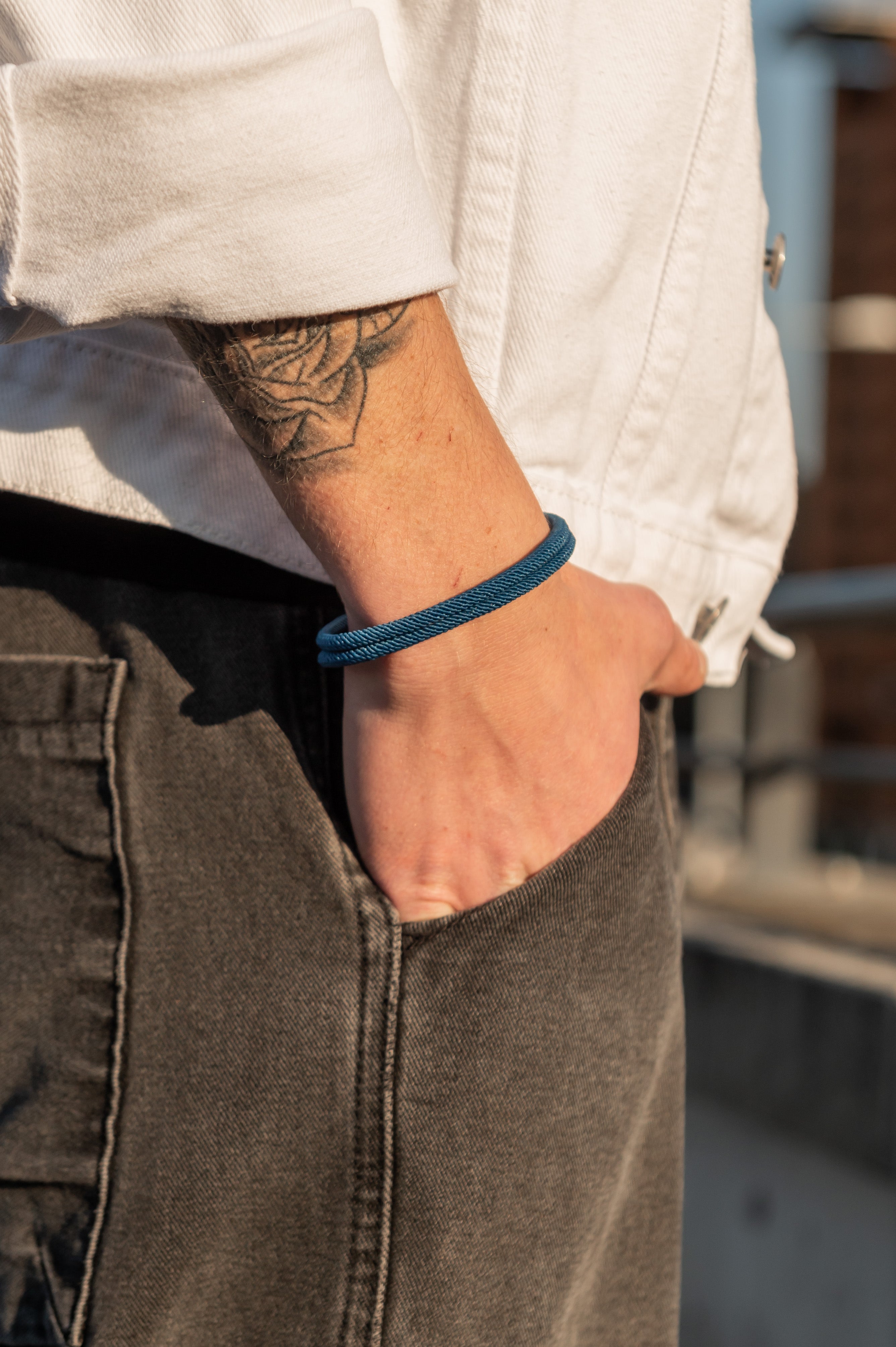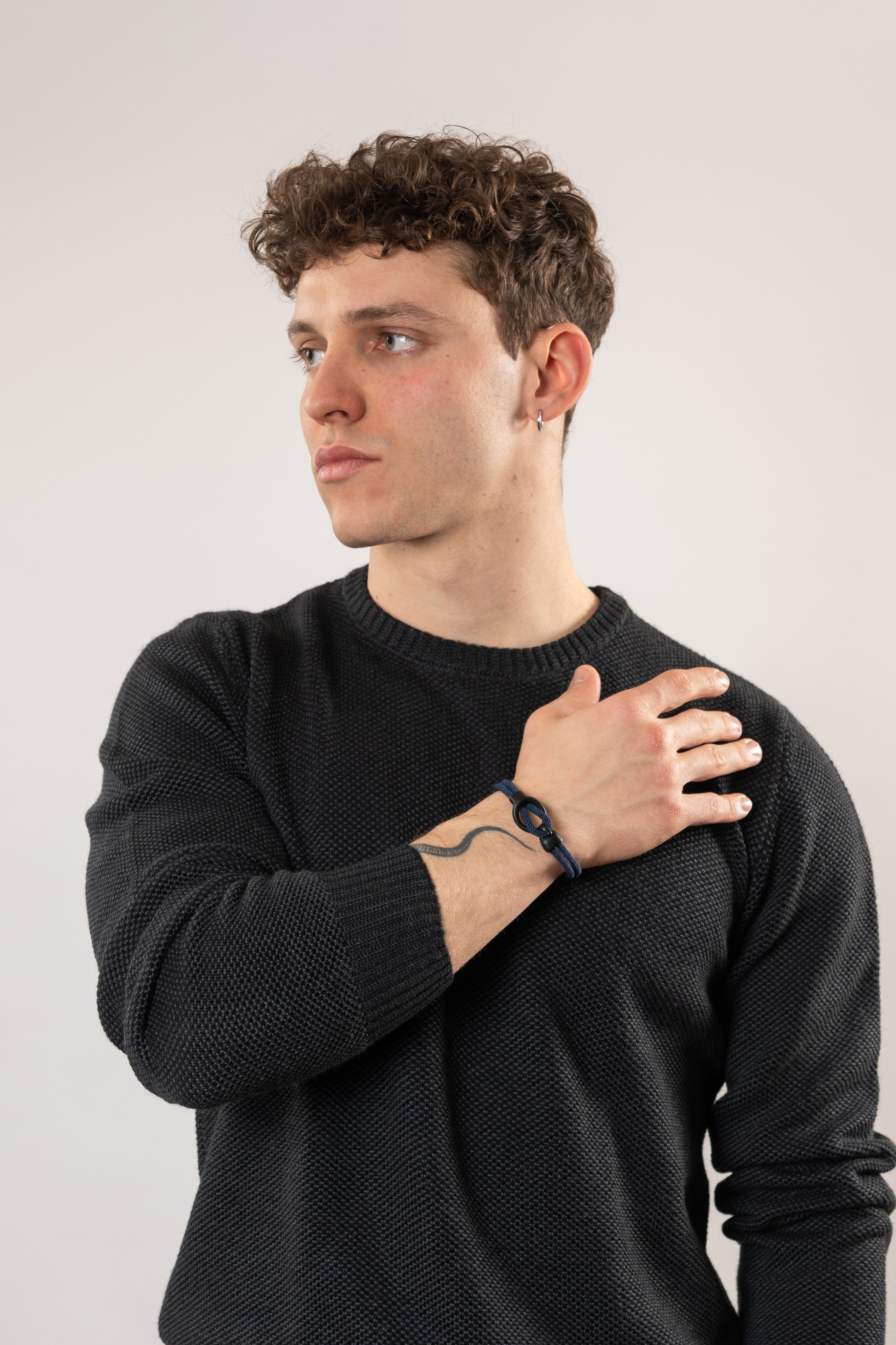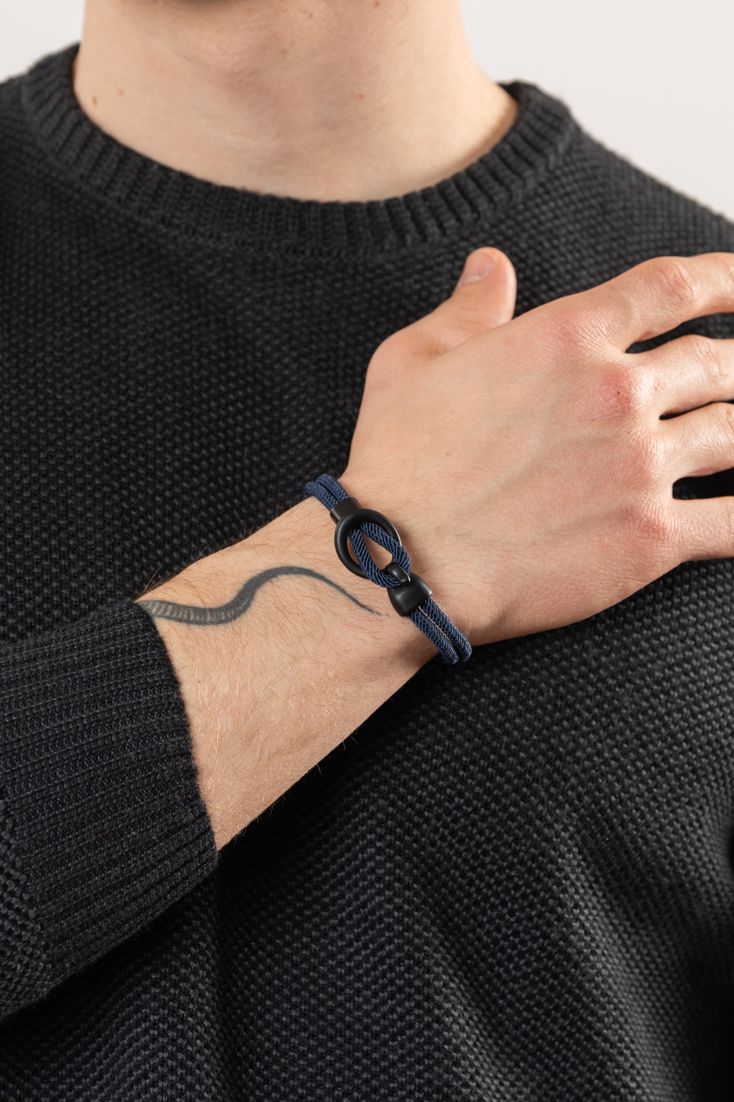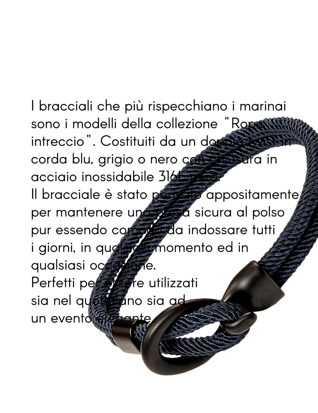Ispirato ai nodi marinai il bracciale rope intreccio è costituito da una struttura in corda che lega le due estremità con un nodo ad un elemento in acciaio inossidabile nero riprendendo lo scenario di un'imbarcazione legata al molo.