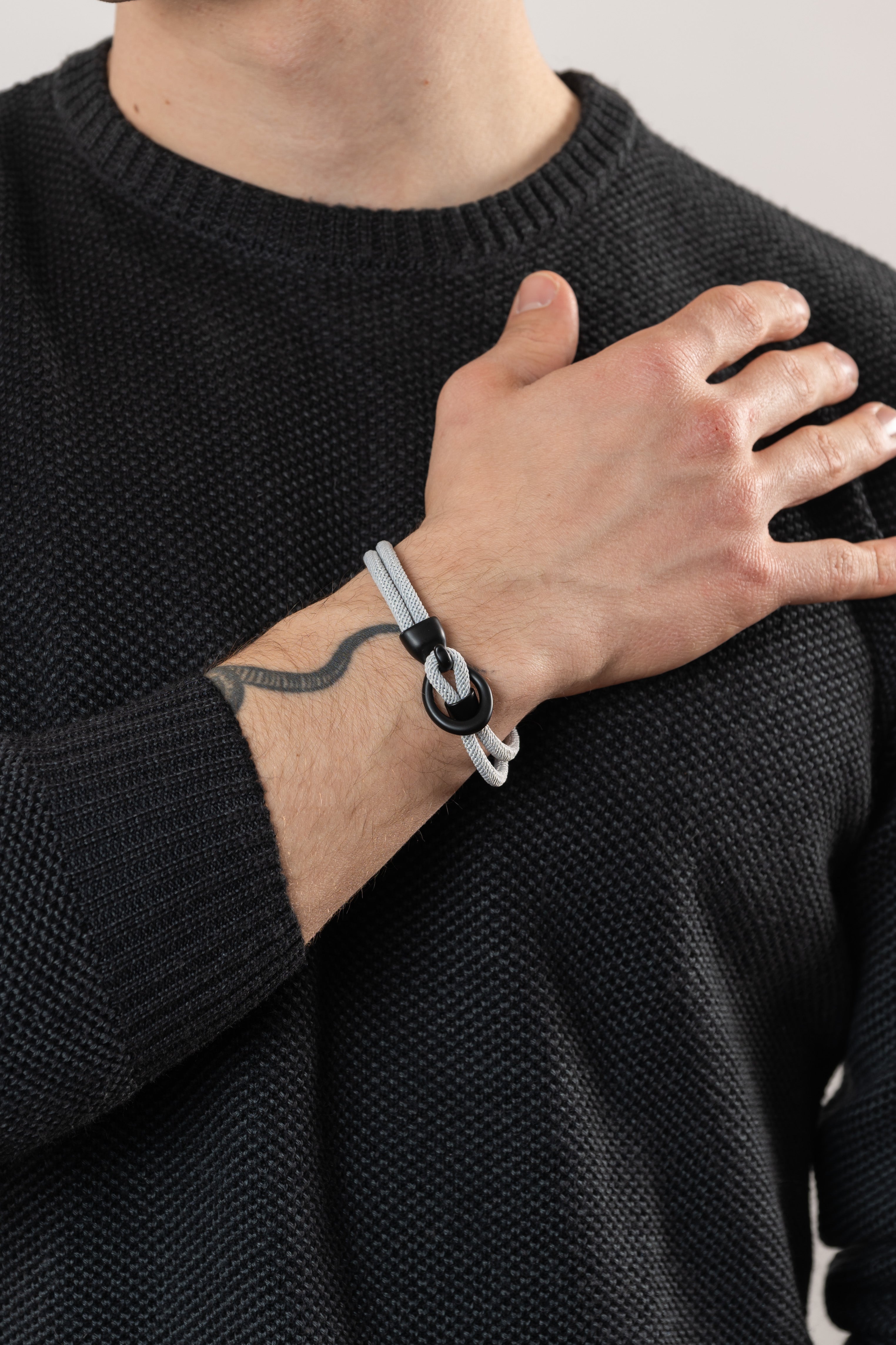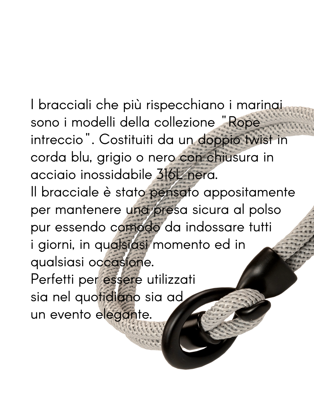 Ispirato ai nodi marinai il bracciale rope intreccio è costituito da una struttura in corda che lega le due estremità con un nodo ad un elemento in acciaio inossidabile nero riprendendo lo scenario di un'imbarcazione legata al molo.
